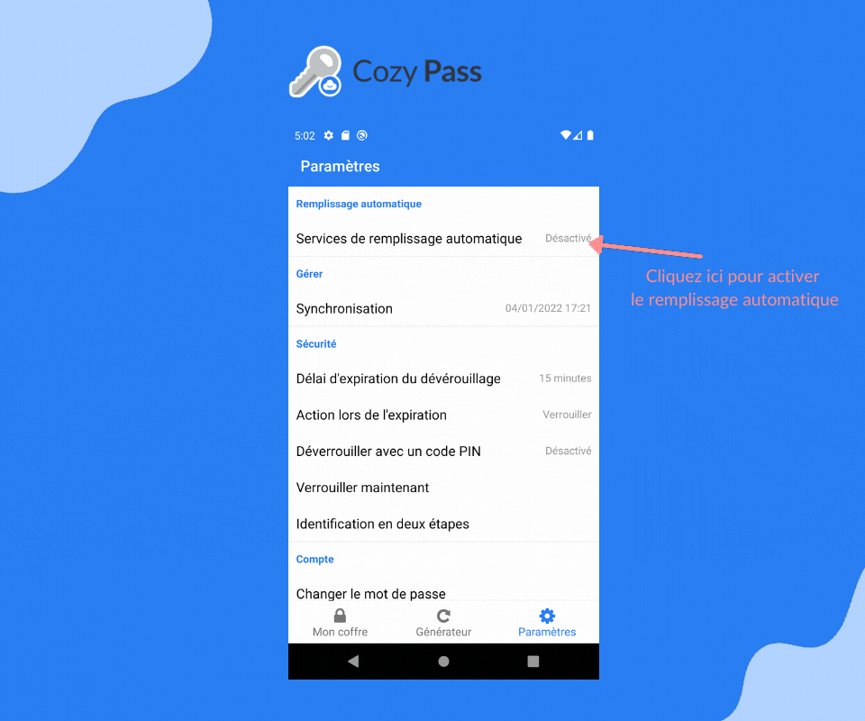 Pour activer le remplissage automatique sur Android, il vous suffit de vous rendre dans les paramètres de l'application Cozy Pass et suivre les instructions :