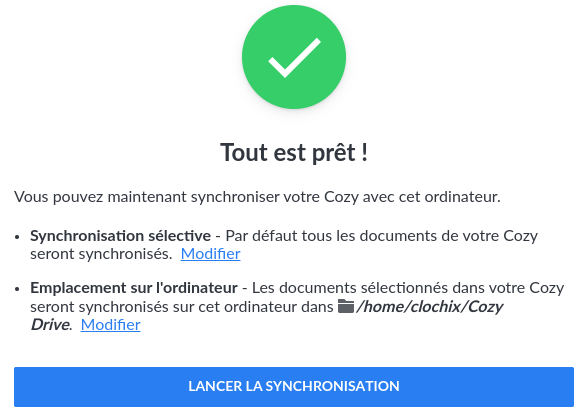L’application va alors relancer le processus de connexion. À la fin, un écran vous permet de configurer les dossiers du serveur à synchroniser avec votre ordinateur et l’emplacement du dossier local.