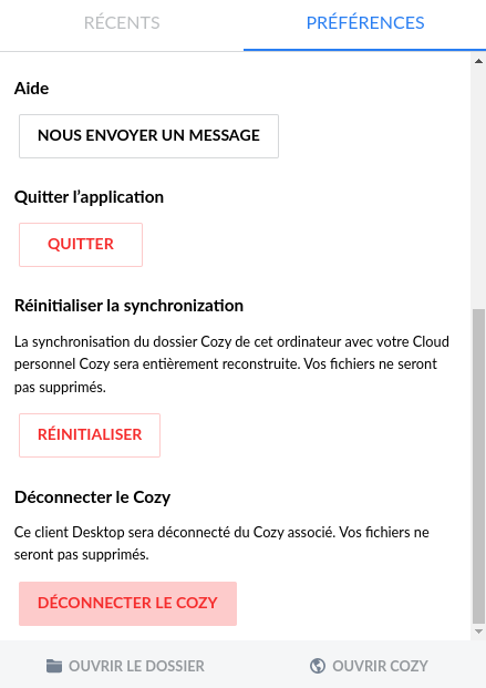 Si vous souhaitez modifier l’emplacement du dossier local synchroniser, il est nécessaire de ré-initialiser la synchronisation. Pour cela, ouvrez l’application Twake Desktop en cliquant sur son icône dans la barre des tâches de votre ordinateur, allez dans l’onglet Préférences, et dans le bas de la fenêtre, cliquez sur le bouton Déconnecter.